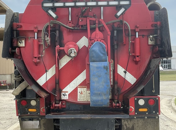 DEBRIS TANK: 9 cu yd capacity, dump body, debris tank deflector, flat door, hydraulic opener & rear door locks, float ball shut off system, liquid float level indicator, debris body “power flush” system, rear 6” knife valve with layflat hose, rear splash guard, side mounted rotating pipe rack, tank mounted pipe rack, gravity drain assembly, decant strainer assembly, pump-off system, remote debris tank grease assembly